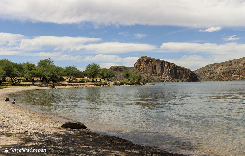 Unten am See angekommen, überquert das Sträßchen auf einer einspurigen Brücke den First Water Creek, der hier eine schöne Bucht bildet und folgt dann weiter der Uferlinie des Canyon Lake Richtung Osten bis zur Acacia Recreation Site, einer schön angelegten Picnic Area direkt am Seeufer mit überdachten Grillplätzen, Restrooms, einer Liegewiese mit schattigen Bäumen und schön angelegtem Badestrand.