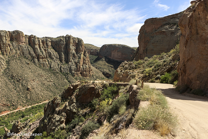 Kurz hinter Tortilla Flat beginnt der ungeteerte Abschnitt des Apache Trail. Von hier bis zum Roosevelt Lake sind es jetzt nochmals 22 Meilen auf zum Teil sehr kurviger und abschüssiger Piste. Obwohl dieser Streckenabschnitt regelmäßig gegradet und ausgebessert wird, kann sich der Straßenzustand vor allem zur Zeit der heftigen Gewitter und Regenfälle im Sommer recht schnell ändern. Sehr enge Passagen mit vielen unübersichtlichen Kurven, Schlaglöcher, stellenweise waschbrettartige Pisten und loses Geröll erfordern auf jeden Fall eine sehr vorsichtige Fahrweise, denn nicht immer sind genügend große Ausweichstellen vorhanden. Besondere Vorsicht ist am Fish Creek Hill geboten, denn hier geht es auf äußerst schmaler, unbefestigter Piste steil bergab. Nach Sommergewittern oder länger andauernden Regenfällen im Frühjahr sollte man den ungeteerten Abschnitt des Apache Trail komplett meiden.