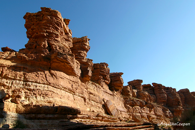 Vom Parkplatz aus überquert man die Straße und steigt dann ein paar Meter hinunter in den gut sichtbaren Wash, der in leichten Windungen Richtung Nordosten führt. Je weiter man kommt, desto höher und steiler werden die von unzähligen Flash Floods aus dem Felsplateau herausgeschliffenen Canyonwände - poröses und mit Myriaden von winzigen Löchern durchsetztes Kalkgestein, zusammengesetzt aus verschieden dicken, übereinandergelagerte Schichten, rund geformte Stufen und Absätze, dazwischen immer wieder kleine Felsnischen und Halbhöhlen.
