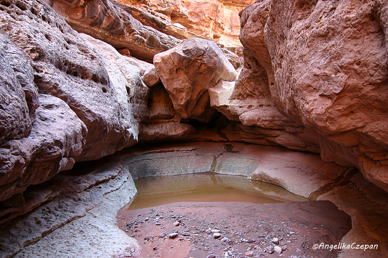 Jetzt muss man ein wenig aufpassen, denn es tauchen immer wieder neue Hindernisse auf, Felsabstürze oder kleine, mit Wasser gefüllte Pools, die man jedoch stets mit etwas Geschick auf schmalen Felsbänken rechts oder links umgehen kann. Ab und zu findet man kleine Steinmännchen, die den Weg markieren. Das ist besonders auf dem Rückweg sehr hilfreich, denn oft muss man schon lange vor einem Hindernis stufenweise am Canyonrand nach oben steigen.