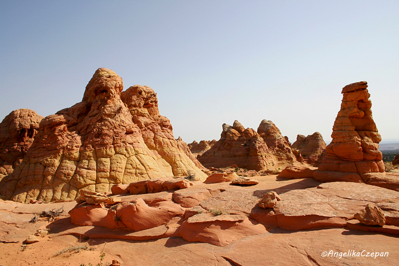 Da es in dem Gebiet der Coyote Buttes South keine markierten Wanderwege gibt, muss man sich einfach am Gelände und an den Himmelsrichtungen orientieren. Hilfreich ist auf jeden Fall ein GPS-Gerät, mit dem man als Erstes den Standort des Fahrzeugs abspeichern sollte. Etwa einen Kilometer westlich des Cottonwood Trailheads beginnt dann das Gebiet der Cottonwood Teepees. Von dort kann man diese weitläufige Felslandschaft dann je nach Lust und Laune weiter erforschen, indem man in einem großen Bogen Richtung Nordwesten und dann nach Norden geht. Neben großen, farbig gestreiften Felshügeln findet man hier auch einige interessante Felsskulpturen, die je nach Phantasie des Betrachters an riesige Eidechsen, Kamele, Enten, Hühner oder Schachfiguren erinnern.