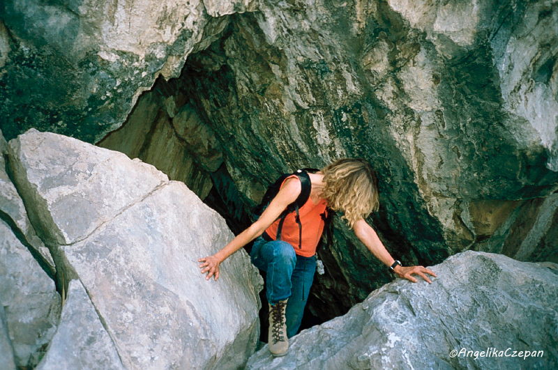 Auf dem Boden der Höhle angekommen, kann man dann im Schein der Taschenlampe anhand der Fußspuren im Sand recht gut den weiteren Weg erkennen. Leuchten Sie auch ab und zu an die Decke, denn an einer Stelle gibt es eine niedrige Passage mit überhängenden Felsplatten. Der Gang durch die schmale, tunnelartige Höhle ist eine spannende Entdeckungstour - nicht vergleichbar mit Führungen durch beleuchtete Tropfsteinhöhlen, denn es herrscht absolute Dunkelheit und Stille. Nur der schwache Schein der Taschenlampe, mit dem man langsam die Decke, die Wände und den Boden ertasten kann, vermittelt ein Gefühl für die Konturen und die Ausmaße der Höhle. Ein absolut faszinierendes Erlebnis! Der Weg endet in einem runden Raum mit einem knapp zwei Meter hohen Stalagmiten.
