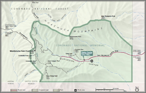 Eine landschaftlich reizvolle, aber sehr staubige und holprige Sand- und Schotterpiste führt vom Montezuma Pass am Ende der Aussichtsstraße des Parks weiter an der mexikanischen Grenze entlang und dann nach Norden zum Parker Canyon Lake im Coronado National Forest. Die 18 Meilen lange Strecke ist recht gut ausgeschildert, aber stellenweise sehr ‚washboarded' und steinig, so dass man sich nur mit einem Geländewagen auf den Weg machen sollte. Unterwegs passiert man zwei etwas tiefere Furten, die zwar die meiste Zeit des Jahres ausgetrocknet sind, bei Regenfällen aber unpassierbar werden können. Fahren Sie also vorsichtig!