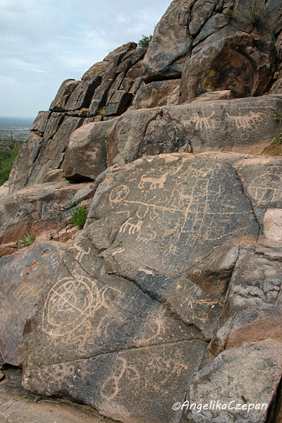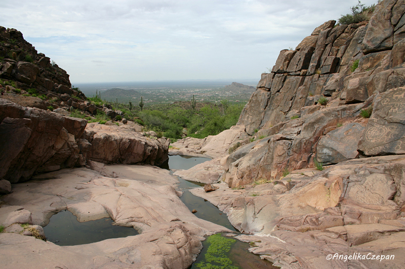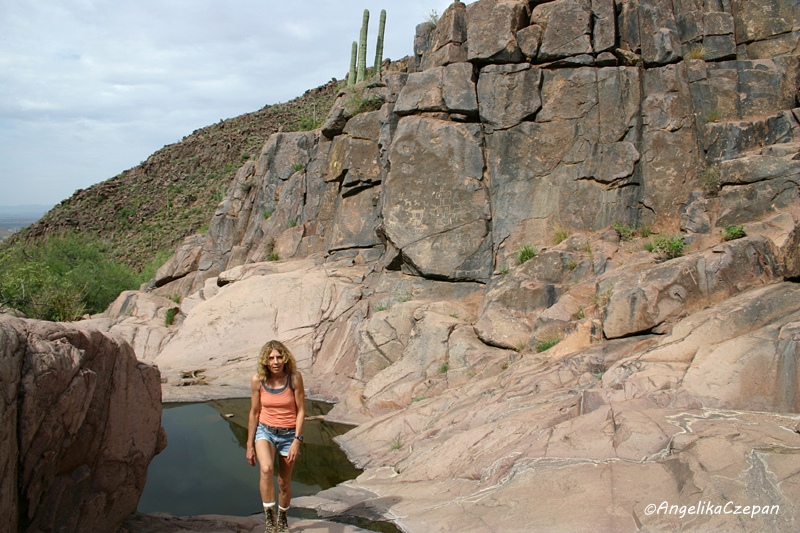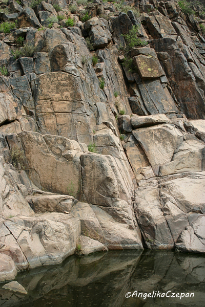 Links davon ansteigend die Bergflanke mit ihren schroffen Felswänden und Kakteen, direkt neben den Pools viele große, dunkle Felsblöcke aus Basalt, übersät mit wunderschönen, gut erhaltenen Petroglyphen. Die meisten davon stellen Bighorn Schafe dar, die wohl früher in diesem Canyon heimisch waren. Daneben findet man auch viele abstrakte Symbole wie z.B. konzentrisch angeordnete Kreise.