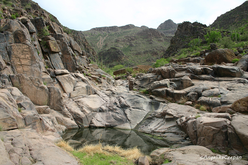 Am Eingang des Canyons angelangt, ändert sich die Vegetation. Alles wird grüner, dichter, Steineichen und große Büsche bieten willkommenen Schatten, riesige Saguaros recken ihre verwinkelten Arme in den Himmel empor. Noch ein Stück bergauf, und schon steht man vor dem felsigen ausgewaschenen Bachbett mit seinen Pools, in denen sich nach Regenfällen das Wasser sammelt (HIER03).