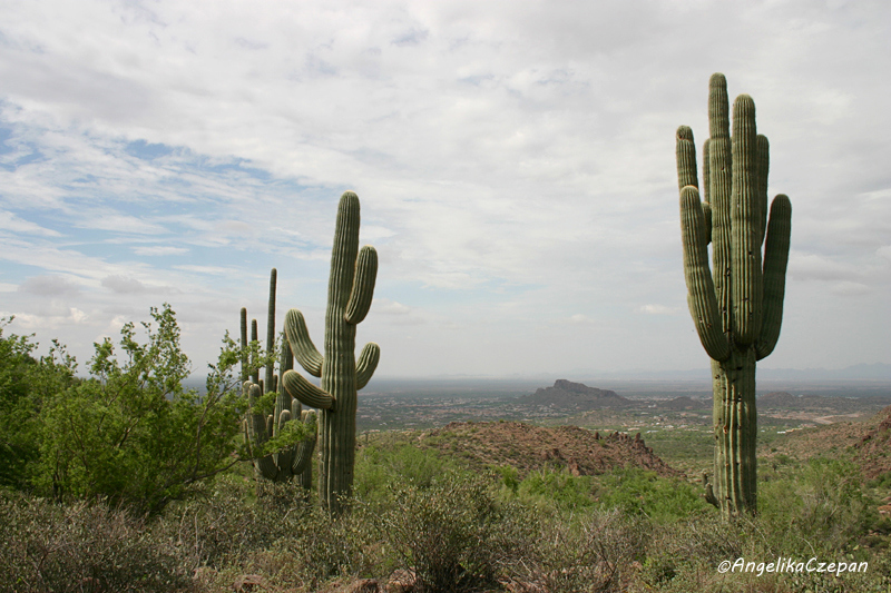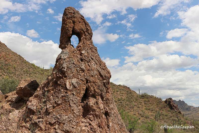 Immer höher klettert der Weg durch das nun breiter werdende Tal bis man schließlich Fremont's Saddle erreicht (HIER06). Von hier hat man zum ersten Mal einen Blick auf die allerdings noch recht weit entfernte Felsnadel Weavers Needle (HIER08). Ein wesentlich besserer Blick bietet sich von Weavers Outlook Ridge, einem schönen Aussichtspunkt nordöstlich des Sattels. Man erreicht ihn, indem man bei Fremont's Saddle rechts abzweigt und diesem Weg 0,5 Meilen folgt (HIER07).