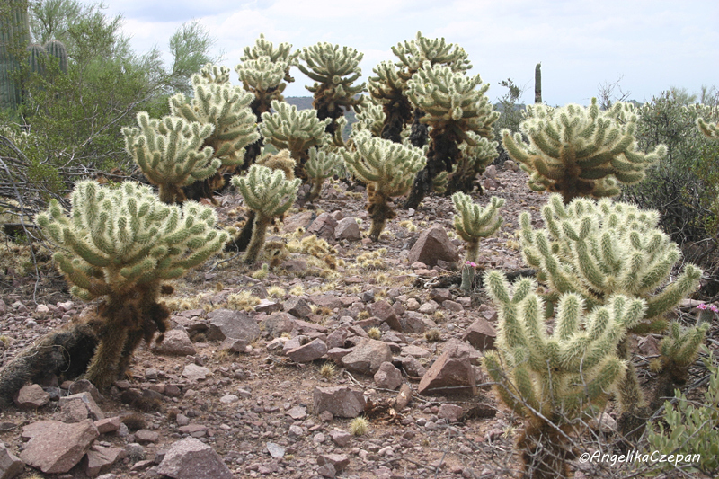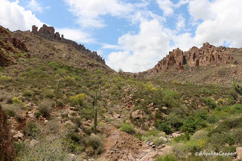 Von dort folgt man dem gut ausgetretenen Weg ein kurzes Stück bergauf bis zu einer Weggabel. Rechts beginnt der Lost Goldmine Trail, links der Hieroglyphic Canyon Trail No. 101. Nachdem man ein Metallgatter mit Kette passiert hat, folgt man einfach immer dem schmalen Wash durch eine schöne Kakteenlandschaft bergauf in Richtung der Superstition Mountains, in deren Westflanke man schon den Einschnitt des Hieroglyphic Canyon erkennen kann.