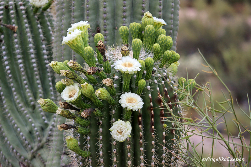 75 Jahre dauert es immerhin, bis der Kaktus eine Größe von 4 bis 5 Metern erreicht und seine ersten Arme ausbildet. Etwa 10 Zentimeter unterhalb der Erdoberfläche bildet der Saguaro im Umkreis von mehreren Metern ein weitverzweigtes Wurzelnetz, das bei den seltenen Regenfällen in kürzester Zeit riesige Mengen Wasser aufsaugen kann. Dieses Wasser, im Stamm des Saguaro gespeichert, kann die Pflanze etwa ein Jahr lang mit Feuchtigkeit versorgen. Vögel wie der Gila Woodpecker bauen in den Hauptstämmen und den größeren Seitenarmen älterer Kakteen in jedem Frühjahr ihre Bruthöhlen. Diese Höhlen schaffen einen Ausgleich von 10 Grad zur Außentemperatur, so dass es in den Innenräumen im Sommer kühler und im Winter wärmer ist. Entsprechend beliebt sind diese Nisthöhlen auch bei anderen Wüstenbewohnern, wie dem Kaktuszaunkönig, Eulen, Fledermäusen und Bienen.
