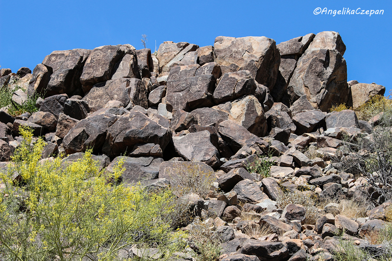 Von der Picnic Area geht es zunächst hinunter in einen Wash und und dann über mehrere Stufen hinauf zum Signal Hill. Dieser große Hügel ist mit großen, dunklen Basaltblöcken übersät, in die die Hohokam vor etwa 1.000 Jahren ihre Symbole und Zeichen einritzten. Einen ersten schönen Blick auf diese Indian Rock Art hat man vom Fuß des Hügels. Weitere Petroglyphen findet man auf den Felsblöcken oben auf dem Gipfelplateau. Wer mag, kann von hier aus noch ein Stück dem Cactus Wren Trail Richtung Norden folgen.