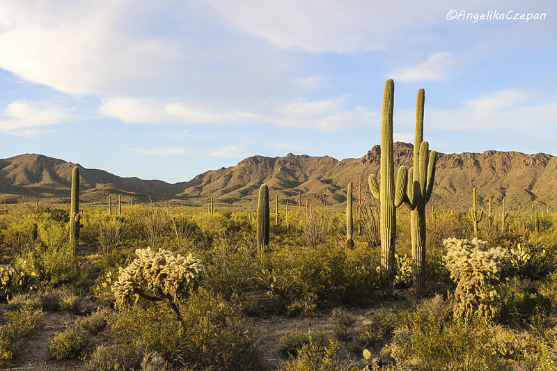 Der Saguaro Nationalpark besteht aus zwei getrennten Parkbereichen, dem Tucson Mountain District westlich von Tucson und dem Rincon Mountain District östlich der Stadt. Beide Gebiete wurden zum Schutz der riesigen Saguaro Kakteen eingerichtet, die charakteristisch sind für die Sonora Wüste des südlichen Arizona. Besonders viele dieser Kakteen findet man im Westteil des Parks. Daneben wachsen im Park auch viele andere Kakteenarten wie Opuntien, Cholla Kakteen, Ocotillos, Prickly Pear und Teddybear Kakteen. Besonders schön ist ein Besuch im Frühjahr und nach heftigen Regenfällen im Hochsommer, wenn viele der Kakteen blühen. Sehenswert ist neben dieser eindrucksvollen Wüstenlandschaft auch der Signal Hill, ein mit großen, dunklen Felsblöcken übersäter Hügel mit Petroglyphen aus der Zeit der Hohokam, die das Gebiet vor etwa 1.000 Jahren besiedelten.