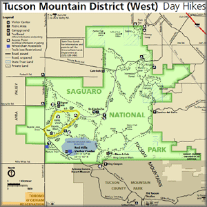 Hinter dem Pass führt das schmale Sträßchen dann in vielen Windungen und Spitzkehren steil hinunter in das flache Wüstengebiet westlich von Tucson (Achtung: dieser Streckenabschnitt ist für größere Wohnmobile nicht geeignet!). Am Ende der Gates Pass Road angekommen, biegt man bei der T-Kreuzung dann nach rechts ab auf die Kinney Road (links liegt Old Tucson). Man fährt nun am Arizona Sonora Desert Museum vorbei und erreicht schließlich nach 5 Meilen das Red Hills Visitor Center von Saguaro West.