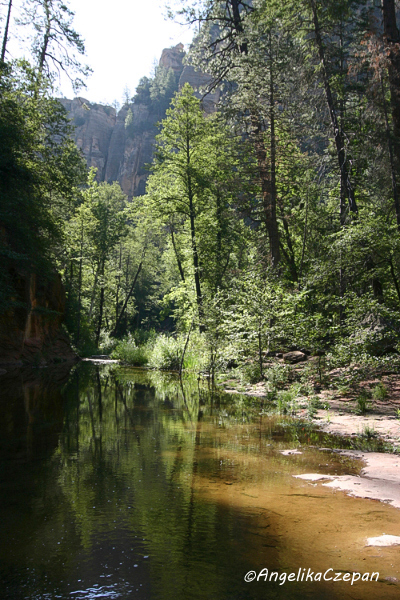 Vom Parkplatz aus überquert man zunächst ein Wiesengelände mit Obstbäumen. Dahinter beginnt der schmale Wanderweg durch den schattigen, bewaldeten West Fork Canyon, der immer wieder auf beiden Seiten von hohen dunkelroten oder hellen Sandsteinfelsen flankiert wird. Besonders schön ist diese schattige Wanderung im Hochsommer, wenn viele Wildblumen blühen, Schmetterlinge und Libellen durch die Luft schwirren und man unterwegs beim Wechsel von einer Seite des Baches auf die andere immer wieder ein kurzes, erfrischendes Fußbad nehmen kann.