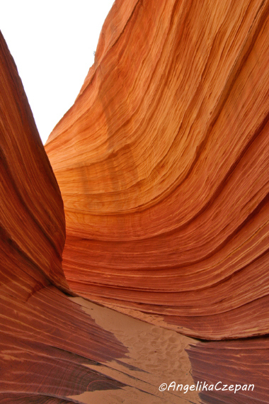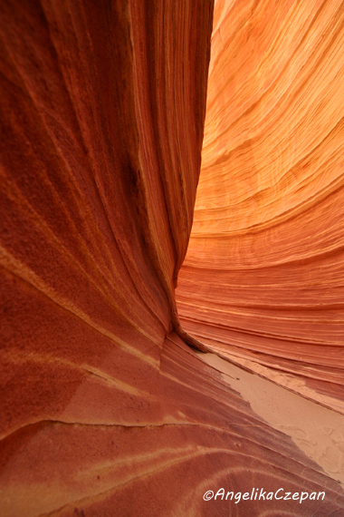 Vom Trailhead aus überquert man die House Rock Valley Road und folgt dann dem breiten Wash 0,5 Meilen nach Osten. Hier befindet sich ein Schild mit der Aufschrift Coyote Buttes, bei dem man rechts auf einen Pfad abbiegt Richtung Süden (WAV02, geradeaus geht es weiter in den Wire Pass Slot Canyon und die Buckskin Gulch). Nun folgt eine längere Querfeldeinwanderung, die nur spärlich mit Steinmännchen und kleinen Schildern markiert ist. Hauptrichtung ist Süden. Man überquert zunächst eine mit Sagebrush bewachsene Fläche und erreicht dann nach 0,6 Meilen einen quer verlaufenden Wash. Dahinter geht es über Slickrockfelsen etwas hoch zu einem Sattel. Hier beginnt auch die Permit Area. Nach weiteren 0,3 Meilen erkennt man geradeaus in der Ferne zwei nebeneinander liegende Felskuppen, die man rechts umgeht. Von hier geht es weiter Richtung Süden. Ziel ist der Spalt in den Felsen, hinter dem sich die Wave verbirgt. Kurz zuvor befindet sich noch ein etwas steiler Hang aus losem Sand, den man erklimmen muss, bevor man staunend am Ziel der Wanderung angelangt ist (WAV03).
