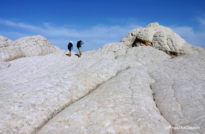 Da das Gebiet der White Pocket etwas kleiner und markanter ist als das der Coyote Buttes South, fällt die Orientierung bei dieser Querfeldeinwanderung etwas leichter. Trotzdem empfiehlt es sich auch hier, ein GPS-Gerät mitzunehmen, den Standort des Fahrzeugs abzuspeichern und sich unterwegs immer wieder die Geländeformationen einzuprägen. Wasser und Sonnenschutz sollte man ebenfalls nicht vergessen.
