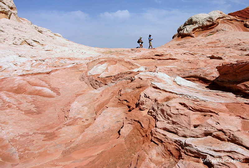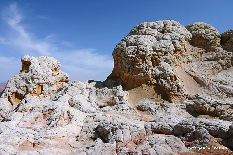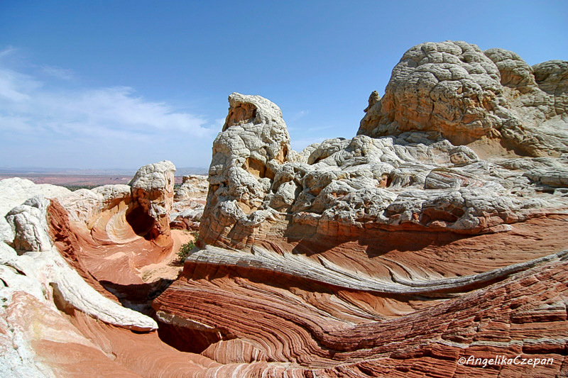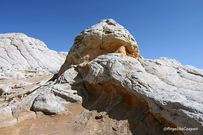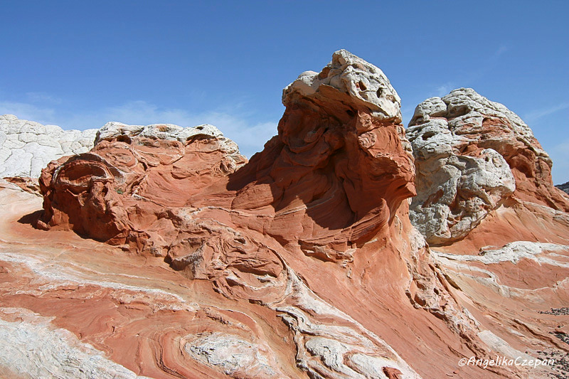 Geht man etwas weiter, gelangt man zu einem mächtigen, sanft ansteigenden Felsenberg, der aus lauter weißen Steinkissen besteht, dann zu einer riesigen rot-weißen Felsspirale und schließlich zu einem kleinen dunkelroten Sandsteincanyon mit weich geschwungenen Wänden, den man auch von innen erkunden kann. Verabschiedet wird man schließlich von einem kleinen Doppel-Hoodoo, der stolz auf einem Hügel thront. Dies ist allerdings nur ein kleiner Ausschnitt dessen, was die White Pocket zu bieten hat, denn hinter jeder Biegung, hinter jedem Hügel wartet wieder eine neue Entdeckung, eine neue Überraschung. Für Fotografen ist die White Pocket schlichtweg ein Traum, ein schier unglaubliches Form- und Farbenparadies, in dem man Stunden damit verbringen kann, umherzustreifen und all diese wunderbaren Kunstwerke der Natur in Bildern festzuhalten.