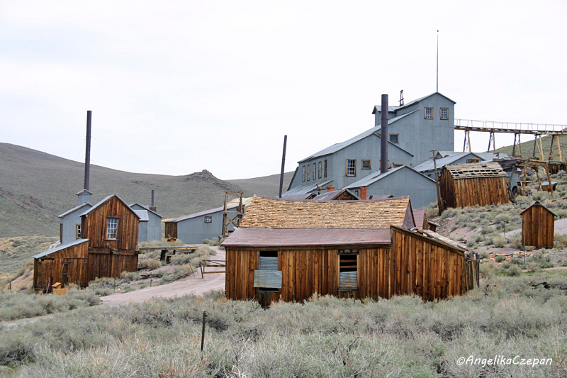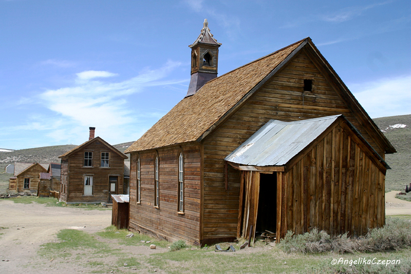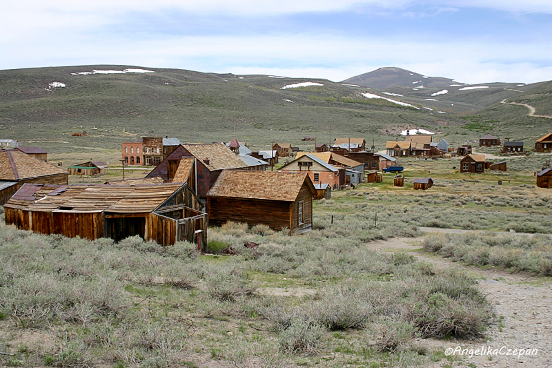 Ein schöner Blick auf die weit über die Hochfläche verstreute Ghost Town bietet sich bereits kurz vor der Entrance Station. Dahinter macht die Straße einen Knick nach links und führt dann in großem Bogen hinauf zum großen Parkplatz auf der Nordwestseite von Bodie. Von hier aus kann man dann zu Fuß durch das weitläufige Gelände streifen und einige der über 100 noch recht gut erhaltenen Gebäude auch von innen besichtigen, darunter die Kirche, das Post Office und das Gefängnis, aber auch viele der ehemaligen Hotels, Bars und Saloons.