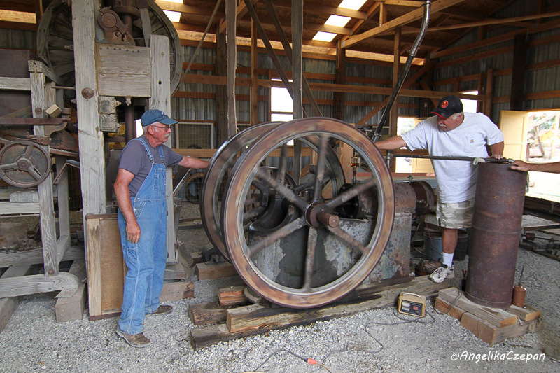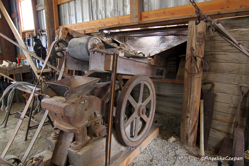 Im Inneren dieses großen Holzgebäudes befindet sich nämlich eine durch viele Schwungriemen angetriebene mechanische Zerkleinerungsanlage für die erzhaltigen Gesteinsbrocken, die in den Bergwerksminen zu Tage gefördert wurden. Angetrieben wurde diese Anlage durch einen Benzinmotor.