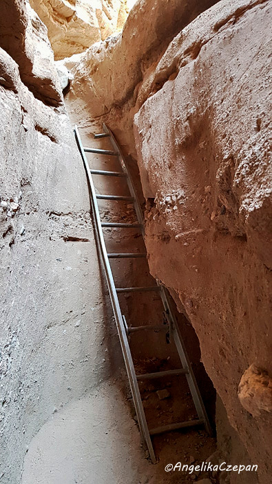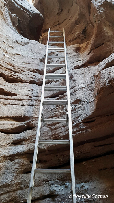 Hat man sich einen Weg über diese Steinquader nach oben gesucht, befindet man sich bereits am Eingang eines interessant gewundenen Slot Canyons mit mehreren Absätzen und Dryfalls, die man mit Hilfe von Leitern überwinden kann. Diese sind allerdings nicht am Fels befestigt, sondern nur angelehnt, so dass man sie schon mit etwas Vorsicht benutzen muss.