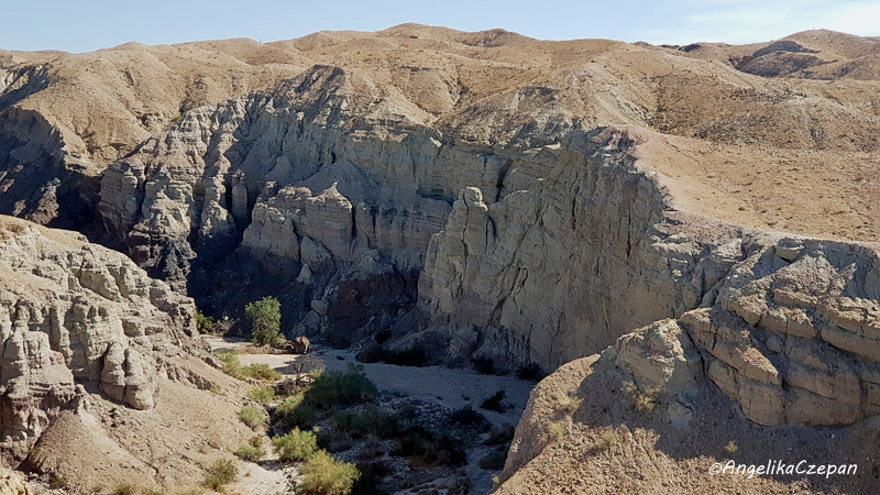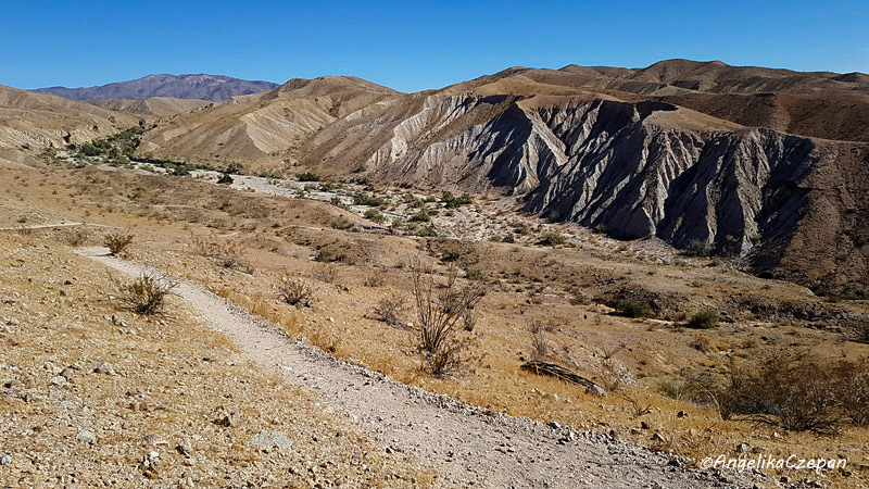 Ist man auf der Kammlinie 0,8 Meilen Richtung Norden gewandert, gelangt man zu einem großen Steinhaufen auf einer Art Plateau, von dem aus man in einiger Entfernung mehrere Sendemasten erkennt. Hier verlässt man nun die Kammlinie und folgt dem schmalen Pfad, der rechts bergab führt hinunter in den Painted Canyon (WP PAINTED-07). Auch hier ist wieder etwas Vorsicht geboten, denn der Pfad ist stellenweise sehr sandig und rutschig. Unten angekommen, wendet man sich nach rechts und wandert nun innerhalb des Big Painted Canyon wieder zurück nach Süden (WP PAINTED-08).