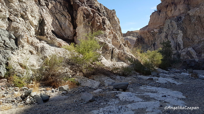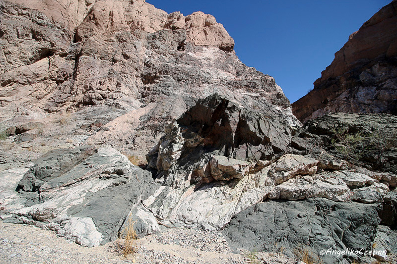 Hier bietet sich nun ein völlig anderes Bild als im schmalen, gewundenen Ladder Canyon, den man gerade durchwandert hat. Der Painted Canyon ist insgesamt breiter und offener, begeistert aber durch seine interessanten Felsstrukturen und seine ungewöhnliche Vielfalt an Gesteinsfarben, die von strahlendem Alabasterweiß über rötliche, braune und bläuliche Farbtöne bis zu dunklem Anthrazit eine ungewöhnlich breite Farbpalette umfasst.