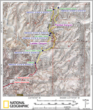 Vom Parkplatz (WP PAINTED-01) wandert man geradeaus hinein in den breiten Big Painted Canyon, der rechts und links von hohen Felswänden flankiert wird. Bereits kurze Zeit später - nach 0,35 Meilen - weist ein Pfahl rechts des Wegs mit der Aufschrift Trail und einem Pfeil nach links zur gegenüber liegenden Canyonseite. Hier befindet sich eine Felsöffnung, deren Eingang etwas durch große, übereinander gewürfelte Steinquader verdeckt ist. Dies ist der Eingang zum Ladder Canyon, einem der zahlreichen Seitencanyons des Painted Canyon (WP PAINTED-02).
