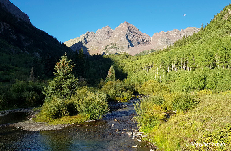 Am westlichen Ortsausgang von Aspen zweigt man beim Kreisel vom Hwy 82 ab auf die Maroon Creek Road (Hwy 13). Von dort fährt man durch den schmalen Canyon 11 Meilen bergauf bis zum großen Parkplatz am Ende der Straße. Hier beginnt der kurze Wanderweg zum Maroon Lake, in dem sich die Berggipfel der über 4.000 Meter hohen Maroon Bells spiegeln. Die Aussicht wird allerdings sehr getrübt durch die Besuchermassen, die bereits kurz nach Sonnenaufgang das Ufer und die Trails rund um den See bevölkern.