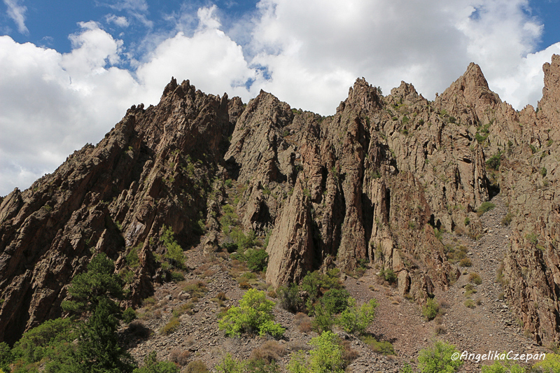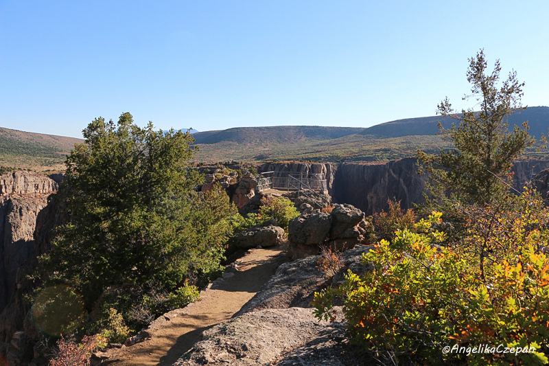 Nicht versäumen sollte man auch den Abstecher zum Devils Lookout, den man über einen kurzen Trail von 0,3 Meilen one-way erreicht. Dabei überquert man einen Felsvorsprung, der in einen Seitencanyon hineinragt. Unterwegs und am Ende des Trails hat man dann einen schönen Blick auf eine Reihe steiler, spitzer Felsgrate, sogenannte Pegmatite Dikes. Dabei wurde geschmolzenes Lavagestein mit hohem Druck durch Felsspalten nach oben gepresst und erkaltete. Auch der Felsvorsprung, auf dem sich der Lookout befindet, ist ein solcher Pegmatite Dikes. Da dieses Gestein sehr hart ist, blieb es stehen, während das umgebende weichere Gestein durch die Erosion abgetragen wurde.