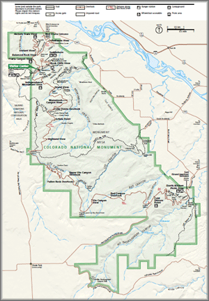 600 Meter über dem Tal des Grand Valley erhebt sich ein gewaltiges Felsmassiv aus rotem Sandstein mit mehreren tief eingeschnittenen Schluchten und Canyons. Von den Aussichtspunkten entlang der Parkstraße, die in großem Bogen durch das Felsengebiet hindurchführt, eröffnen sich immer wieder sehr schöne Ausblicke in die Seitencanyons und auf die weite Ebene des Colorado River Valley bis zu den nördlich gelegenen Roan Cliffs. Zu den besonders sehenswerten Felsformationen gehört das Independence Monument, eine frei stehende 137 Meter hohe Felspyramide aus rotem Sandstein.