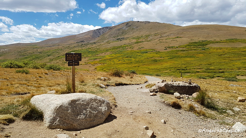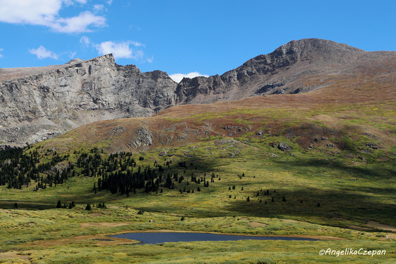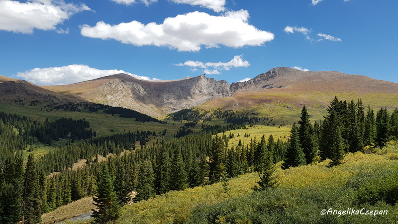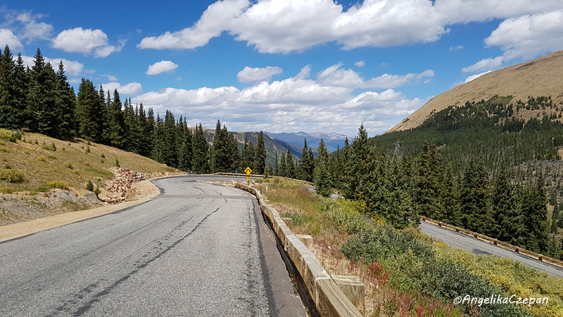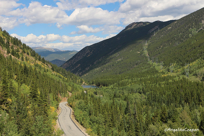 Nach dieser Abzweigung verlässt die Straße den Wald und führt dann oberhalb der Baumgrenze in mehreren Spitzkehren hinauf auf den 3.547 Meter hoch gelegenen Guanella Pass. Hier beginnt auch der 3,6 Meilen lange Wanderweg auf den 4.287 Meter hohen Mount Bierstadt, einem der einfacheren Fourteeners (Berge über 4.000 Fuß) in Colorado (Höhenunterschied 866 Meter). Gleich hinter dem Pass liegt auf der anderen Straßenseite der Parkplatz für die Wanderung zu den Square Top Lakes, einer Reihe kleiner Bergseen (2,1 Meilen, 328 Höhenmeter).