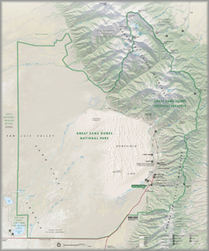 Zufahrt: 6 Meilen südlich des Great Sand Dunes Visitor Centers vom Hwy 150 nach Westen auf die Ln 6 abbiegen, dann 8,5 Meilen bis zum Parkeingang