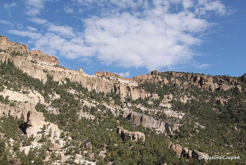 Dort beginnt nun der eigentliche Weg durch den Cottonwood Canyon. Er folgt als schmaler Jeeptrail zunächst fast eben dem mit üppigem Grün bewachsenen Bachbett des Cottonwood Creek, bis man nach einer weiteren halben Meile eine kleine Feuerstelle und den Beginn des offiziellen Trailhead erreicht (FORT07). Hier wird aus dem Jeeptrail ein schmaler Fußpfad, der nun auf der linken Seite des Cottonwood Canyon im Wald bergauf führt. In leichtem Auf und Ab gewinnt man dabei zusehends an Höhe, bis sich der Wald nach einer weiteren Meile lichtet und man auf einer kleiner Felskanzel steht.