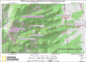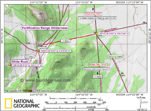 Von Ely fährt man 27 Meilen nach Südosten bis Majores Junction (Majors Place) und zweigt dort nach Süden ab auf den Hwy 93 Richtung Pioche/Caliente. 19 Meilen südlich dieser Kreuzung zweigt nach links (Osten) eine Dirt Road ab, ausgeschildert mit ‚Atlanta' (FORT01). Dies ist die Zufahrtsstraße zur Fortification Range, die White Pine County Rd. 47. Von hier sind es etwa 12 Meilen ‚graded' Dirt Road bis zur Abzweigung White Rock und noch einmal 2,4 Meilen bis zur Abzweigung Richtung Cottonwood Canyon.