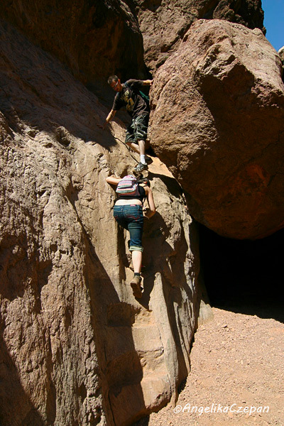 Schließlich erreicht man das erste schwierige Hindernis, einen großen Felsblock, auf dessen rechter Seite man etwa 5 bis 6 Meter über mehrere in den Stein gehauene Felsstufen hinabklettern muss (ca. 1 Meile ab Trailhead). Das Problem sind dabei die ersten zwei, drei Stufen, die etwas schmal, sandig und abschüssig sind. Also Vorsicht, denn hier befindet sich auch kein Seil! Etwa eine halbe Meile weiter kommt man zu einer Stelle, an der mehrere Canyons zusammentreffen. Diese Stelle sollte man sich gut einprägen, damit man auf dem Rückweg den richtigen Canyoneingang wählt (GOLD04).