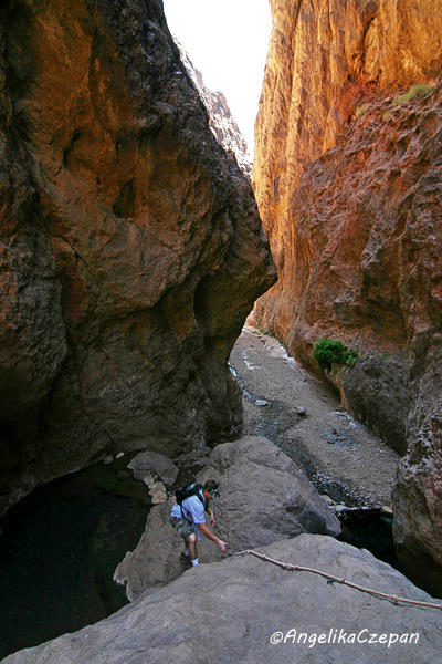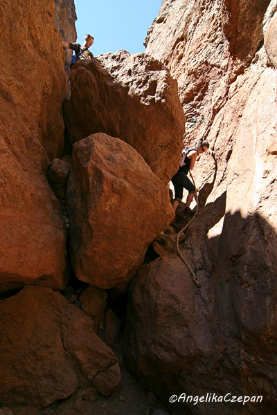 Um das Auf- und Abklettern zu erleichtern, wurden an den großen Felsblöcken dicke Taue mit Knoten angebracht. Diese sollte man nach Gebrauch immer wieder so legen, dass sie die von unten kommenden Personen gut erreichen können. Zwischen den Pools und der Einmündung in den Colorado gibt es eine mehrere Meter hohe Felswand (allerdings mit guten Griffen!), die man hinauf- und wieder hinunterklettern muss (Schwierigkeitsgrad 3). Ebenfalls nicht ganz ungefährlich ist das Absteigen über zum Teil schmale und sandige Trittstufen an einem großen Felsblock neben dem ersten großen Chockstone. Diese sowie all die anderen Stellen mit Seilen sollte man sich nur zutrauen, wenn man sich sicher ist, dass man nicht nur hinunter, sondern auch wieder hoch kommt. Auf das GPS-Gerät sollte man sich bei dieser Wanderung übrigens nicht zu sehr verlassen, da durch die hohen Canyonwände ein Empfang der Satellitensignale erschwert wird.