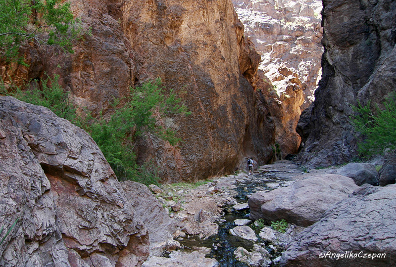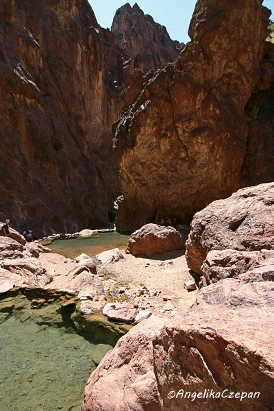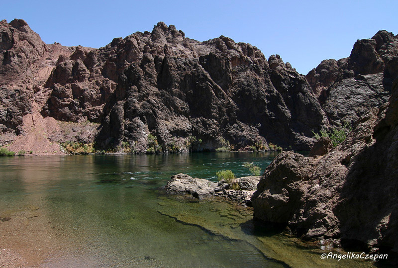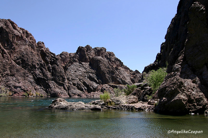 Dieser letzte Abschnitt des Weges ist gleichzeitig der schwierigste und anspruchsvollste, denn man muss zahlreiche große Boulder bzw. Abseilstellen sowie eine mehrere Meter hohe Felswand überwinden. Hat man es aber geschafft, steht man plötzlich staunend am Ufer des Colorado, der an dieser Stelle ungewöhnlich klares und türkisfarbenes Wasser hat (GOLD07).