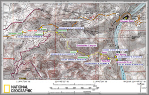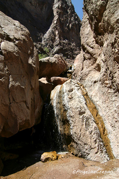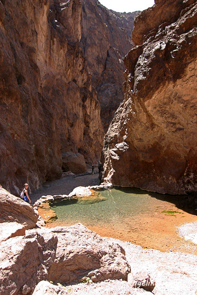 Während sich der Canyon weiter verengt, wandert und klettert man auf diese Weise weiter bergab, bis man schließlich die ersten großen Badepools erreicht (GOLD05). Von dort aus fließt ein schmaler ‚Hot Creek', dessen Ränder von Algen bunt gefärbt sind, weiter canyonabwärts Richtung Colorado, vorbei an Felswänden mit hängenden Farnen, kleinen Wasserfällen und einer schönen Felsgrotte (GOLD06).