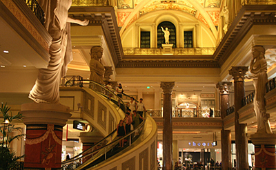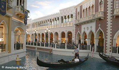 Einkaufspassage unter künstlichem Himmel mit Geschäften, Galerien und Boutiquen im Hotel Venetian. Im Zentrum des Shoppingcenters befindet sich der Markusplatz, an dem Kunsthandwerker alte venezianische Handwerkskünste vorführen. Wer will, kann sich auch von einem Gondoliere über den 400 Meter langen Canale Grande rudern lassen.