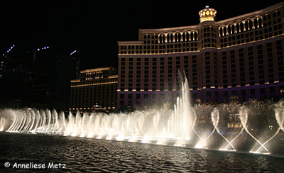 Spektakuläre 300 Meter lange Licht- und Wasserspiele mit bis zu 152 Meter hohen Fontänen zu moderner und klassischer Musik vor dem Bellagio Hotel Casino nahe der Kreuzung Flamingo Rd. und Las Vegas Blvd., besonders sehenswert bei Nacht. Aufführungen Mo-Fr 15-24 Uhr, Sa/So 12-24 Uhr (bis 19 Uhr alle halbe Stunde, danach alle 15 Minuten). Sehenswert ist auch der Botanische Garten hinter der Rezeption des Bellagio Hotels, der entsprechend der Jahreszeit gestaltet wird.