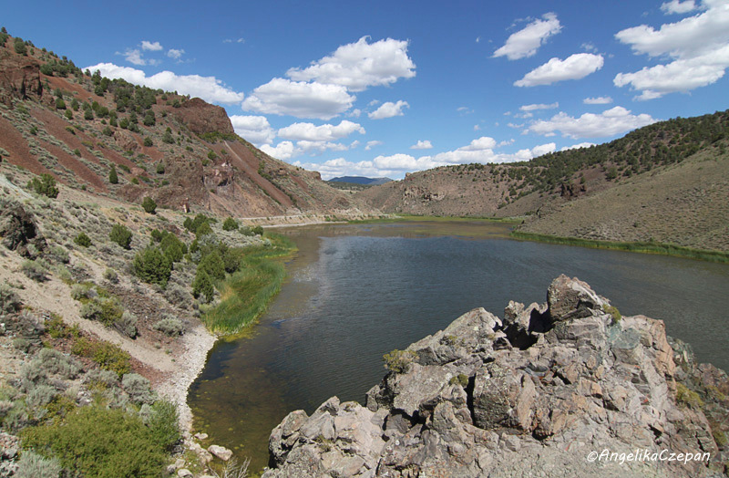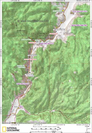 Hinter der Recreation Site öffnet sich nun das Tal und man erreicht den offiziellen Eingang zum Spring Valley State Park. Gleich dahinter liegt eingebettet in eine schöne Felslandschaft das Eagle Valley Reservoir, ein malerischer kleiner Stausee, an dessen Ufer man kleine Elektro- und Tretboote mieten kann und der vor allem bei Anglern sehr beliebt ist. Hier befindet sich auch der Hauptcampingplatz des State Parks, der Horsethief Gulch Campground. Da er größere Stellplätze besitzt und über eine eigene Dumpstation verfügt, ist dieser Platz vor allem bei Wohnmobilbesitzern beliebt. Allerdings geht es hier aufgrund der Nähe zum See auch wesentlich lauter zu.