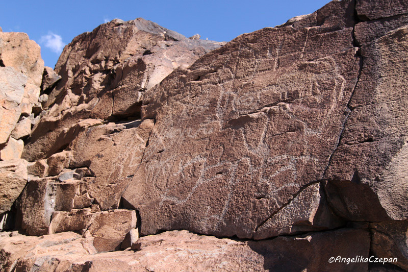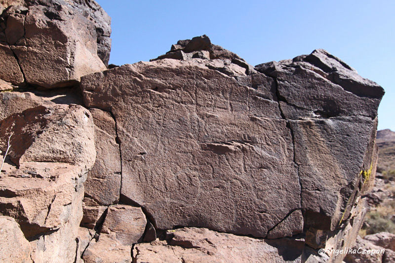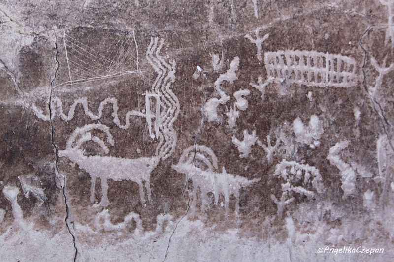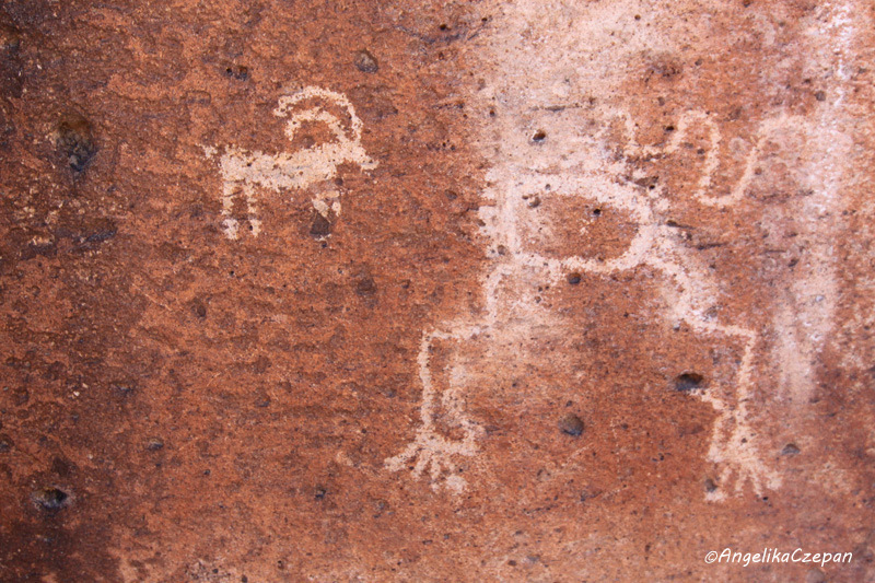 Kurz nachdem man den Cattleguard überquert hat, kommt eine erste Weggabel. Hier links halten. Bei der nächsten Weggabel das Auto abstellen (WHITE02) und auf dem rechten Weg, der auf einer Art Damm entlangführt, zu Fuß noch etwa 150 Meter weitergehen, bis der Weg an einer Art Wendekreis endet. Von hier aus geht man einfach ein paar Meter hinunter in den Wash. Die Felszeichnungen befinden sich auf einer Gruppe dunkelbrauner Felsblöcke auf der linken Seite (WHITE03). Dargestellt sind menschliche Figuren, Bighorn Schafe, aber auch Zickzacklinien und verschiedene geometrische Formen. Die Qualität der Felsbilder schwankt sehr stark. Manche sind sehr gut erhalten, andere dagegen schon stark verwittert.