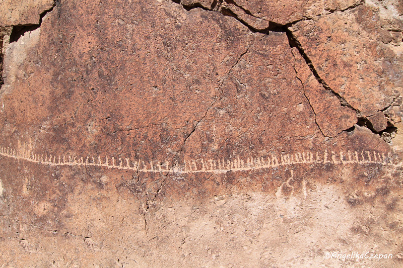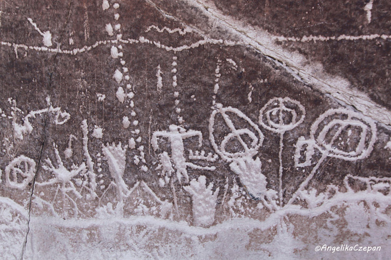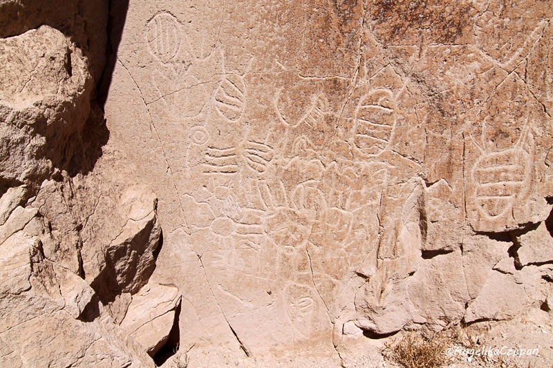 Hauptmotiv ist auch hier wieder eine lang gezogene Strichlinie ähnlich dem Calendar Fence, die in diesem Fall jedoch mit unzähligen Bildern und Symbolen ausgeschmückt ist. Vielleicht sollten damit in einer Art Bildkalender wichtige Jahre und Ereignisse festgehalten werden. Links des Petroglyph Panels befinden sich einige weitere kleinere Felsritzungen, die allerdings schon teilweise mit moderner Graffiti verunstaltet wurden. Vielleicht ist dies auch der Grund, warum der Nordeingang in dieses Tal vor einigen Jahren gesperrt und sämtliche Hinweisschilder zu den White River Narrows Petroglyphs vom BLM entfernt wurden - als Vorsichtsmaßnahme, um diese einzigartigen Felsenbilder vor weiterer Zerstörung zu schützen. Daher auch hier die Bitte an alle, die diesen wunderschönen Ort besuchen: Berühren Sie nichts und freuen Sie sich einfach an dem, was Sie sehen. Oder wie die Amerikaner es so schön ausdrücken: Take nothing but photos, leave nothing but footprints.