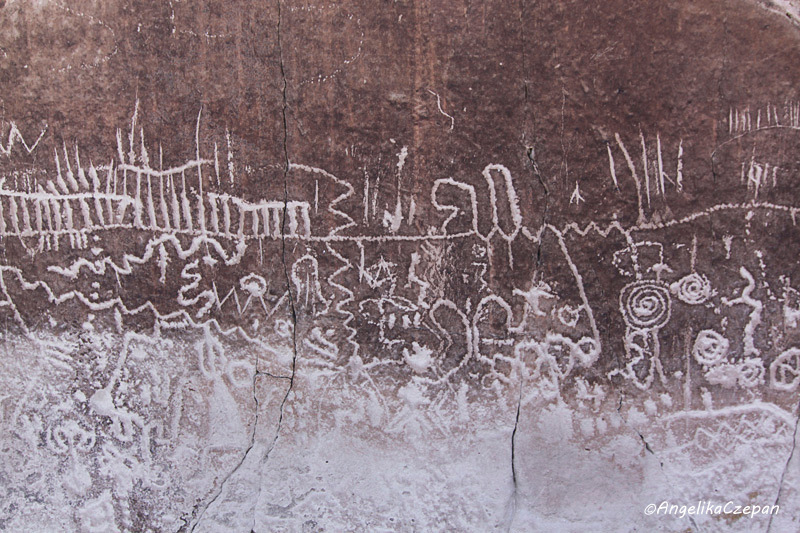 Zurück auf dem Hauptweg folgt man nun der rechten Spur. Diese führt weiter dem ausgetrockneten Bachbett des White River folgend zuerst nach rechts und dann in großem Bogen wieder nach links, bis man das Amphitheater erreicht. Hier befindet sich auch eine kleine Register Box des BLM. Geht man von hier aus an der linken Felswand entlang, steht man plötzlich vor einer mehreren Meter langen, ungewöhnlich schönen und detailreichen Bildergalerie, die zu den beeindruckendsten Petroglyph Panels des Südwestens zählt (WHITE06).
