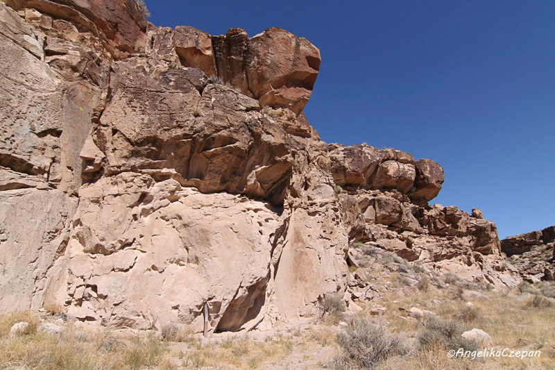 Diese kleine Felszeichnung befindet sich direkt neben dem Highway 318, etwas mehr als 2 Meilen nördlich der Abzweigung zu den oben genannten Petroglyph Sites (WHITE07). Man parkt einfach das Fahrzeug am Straßenrand und geht dann hinüber zur Felswand auf der Westseite der Straße. Die genaue Stelle ist auch hier durch einen Pfosten des BLM markiert. Hauptmotiv ist eine Art Gesicht oder Maske mit langen, mehrfach abgewinkelten Armen und großen, ausgeprägten Händen. Auf der Hinterseite des Gesichts ist eine Wellenlinie angedeutet. Die genaue Bedeutung dieser Zeichnung bleibt auch hier der Fantasie des Betrachters überlassen. Links davon sind einige Bighorn Schafe dargestellt.