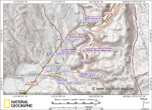 Bei den White River Narrows handelt es sich um eine Reihe weit verzweigter Canyons, die auf beiden Seiten von bis zu 50 Meter hohen Felswänden aus Rhyolithgestein eingerahmt sind. Diese bieten auch Schutz vor den starken Winden, die in diesem Gebiet häufig über die Ebene jagen. Die Täler selbst sind relativ breit und mit vielen Wildkräutern, Gräsern und Sagebrush bewachsen. Für die Menschen, die früher ihn diesem Gebiet lebten, eigneten sie sich damit hervorragend als Lagerplatz, aber auch um Weidetiere zu halten oder einfache Nutzpflanzen anzubauen. Aus den auf den Felszeichnungen dargestellten Szenen schließt man, dass die Canyons auch dazu genutzt wurden, um Wildtiere einzufangen, indem man die schmalen Nord- und Südeingänge der Täler mit Zäunen oder Holzgattern abriegelte.