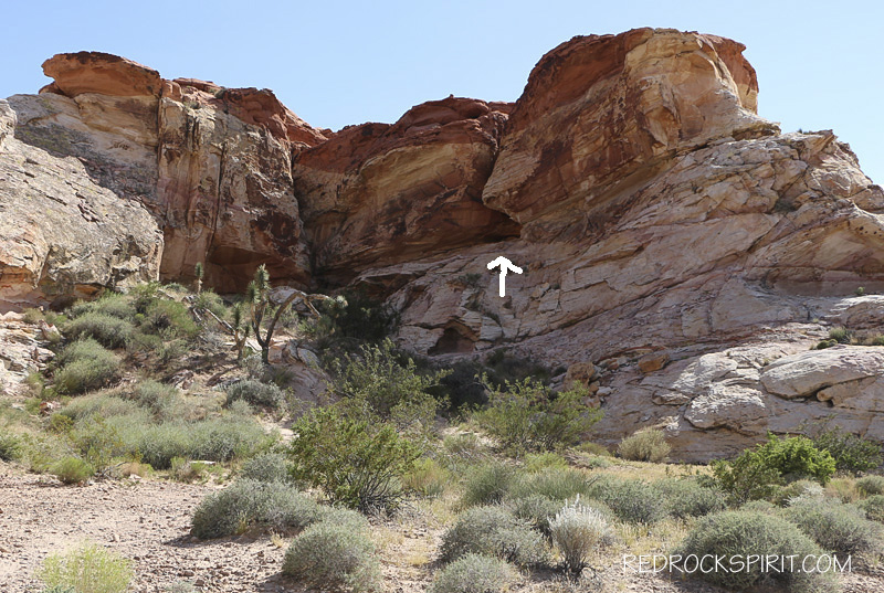 Geht man an der Gabelung dagegen links, gelangt man in einen Felsenkessel, auf dessen rechter Seite oben im Fels eine schmale Öffnung zu erkennen ist (WHITNEY-06). Schaut man sich diese Öffnung genauer an, erkennt man unmittelbar links davon sowie auf der Felswand rechts daneben einige Petroglyphen. Klettert man zu der kleinen Felsöffnung hinauf und dann durch diese hindurch auf die andere Seite, hat man von oben einen schönen Blick auf das südwestliche Felsengebiet der Whitney Pocket.