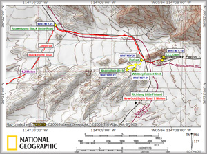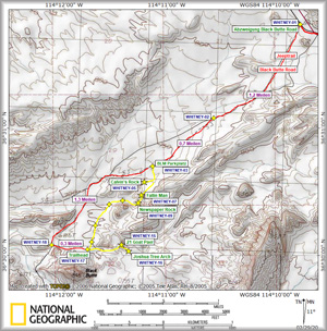 Zufahrt: vom BLM Parkplatz, dem Trailhead der vorigen Wanderung, fährt man auf der ungeteerten Black Butte Road noch 1,3 Meilen weiter nach Süden bis zu einer Senke, an der von links ein Wash einmündet (WHITNEY-18). Hier biegt man links ab und folgt dem Wash 0,3 Meilen nach Osten bis zum Parkplatz und Trailhead, der durch einige Holzbalken markiert ist (WHITNEY-17).