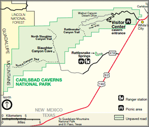 Eine zweite, etwas abenteuerlichere Höhle, die Slaughter Canyon Cave, liegt südwestlich der Carlsbad Caverns. Man erreicht sie über eine separate Zufahrtsstraße, die County Road 418, die 5 Meilen südwestlich von Whites City vom Highway 62/180 nach Osten abzweigt. Vom Parkplatz am Ende dieser Straße ist es dann allerdings nochmals eine halbe Meile zu Fuß bis zum Höhleneingang, an dem die geführten Touren beginnen. Man sollte also genug Zeit für diesen Abstecher einplanen, da man auch mindestens 15 Minuten vor Beginn der Tour am Treffpunkt vor der Höhle sein sollte. Eine Erkundung der Slaughter Canyon Cave auf eigene Faust ist nicht möglich.Von dem auf zwanzig Meilen erforschten Höhlensystem der Carlsbad Caverns können insgesamt drei Meilen auf sogenannten self-guided Trails erkundet werden. Daneben gibt es auch noch von Rangern geführte Touren durch die etwas abgelegeneren Bereiche der Höhle (tel. Anmeldung unter 1-877-444-6777).