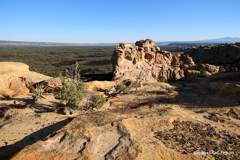 Der Sandstone Bluffs Overlook befindet sich am Ende einer 1,5 Meilen langen Zufahrtsstraße, die vom Hwy 117 nach Westen abzweigt. Von hier sind es nur wenige Schritte bis zur 100 Meter steil abfallenden Felskante aus hellgelbem Dakota Sandstein, von der man das riesige dunkle Lavafeld von El Malpais überblicken kann. Vom Overlook erstrecken sich diese Felsklippen über insgesamt 3 Meilen nach Norden. Einen markierten Weg gibt es allerdings nicht. Aufpassen sollte man auch auf kleine Kinder, denn die steil abfallenden hohen Felskanten sind nicht gesichert. Bestes Fotolicht hat man bei den Sandstone Bluffs am frühen Morgen.