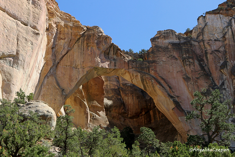 Vom kleinen Parklatz auf der Ostseite des Highway 117 führt ein kurzer Wanderweg von 0,25 Meilen zu einem Aussichtspunkt, von dem man nach oben auf die klobige Steinbrücke aus hellem Sandstein blickt. Leider lässt sich der schöne Steinbogen nur schlecht fotografieren, da sich direkt dahinter eine Felswand befindet. Bestes Fotolicht hat man hier am späten Nachmittag.