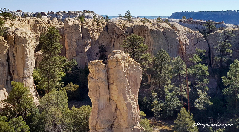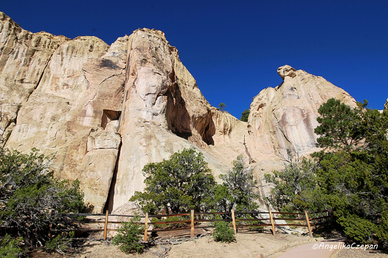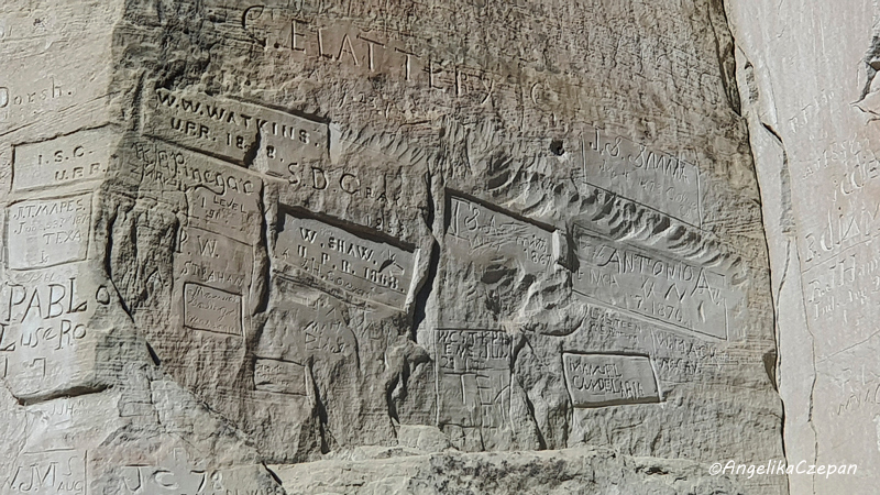 Ebenfalls sehenswert ist der hohe Sandsteinpfeiler am rechten Ende der Felswand, der wie eine historische Litfaßsäule über und über mit Inschriften bedeckt ist, vorwiegend aus der Zeit der amerikanischen Besiedlung. Das hier in vielen Inschriften auftauchende Kürzel U.P.R steht für die Union Pacific Railroad, die im Gebiet von El Morro 1868 eine Vermessung durchführen ließ. Das Projekt wurde allerdings nie ausgeführt und die Bahnlinie schließlich 25 Meilen weiter nördlich erbaut. Hinter dem Felspfeiler führt der Weg noch zu einigen Inschriften auf der Rückseite der Felswand, bevor er dem Loop folgend wieder zurück kehrt zum Visitor Center.